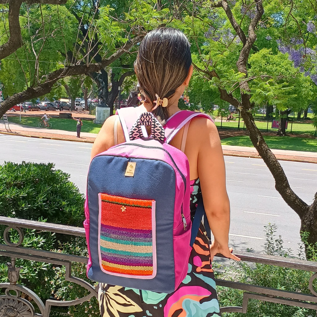💖 Mochila azul y fucsia con bolsillo frontal tejida en telar. 💖 En dos Medidas: 35 cm alto x 26 cm ancho x 12 cm profundidad y 40 cm alto x 30 cm ancho x 13 cm profundidad 🌻
