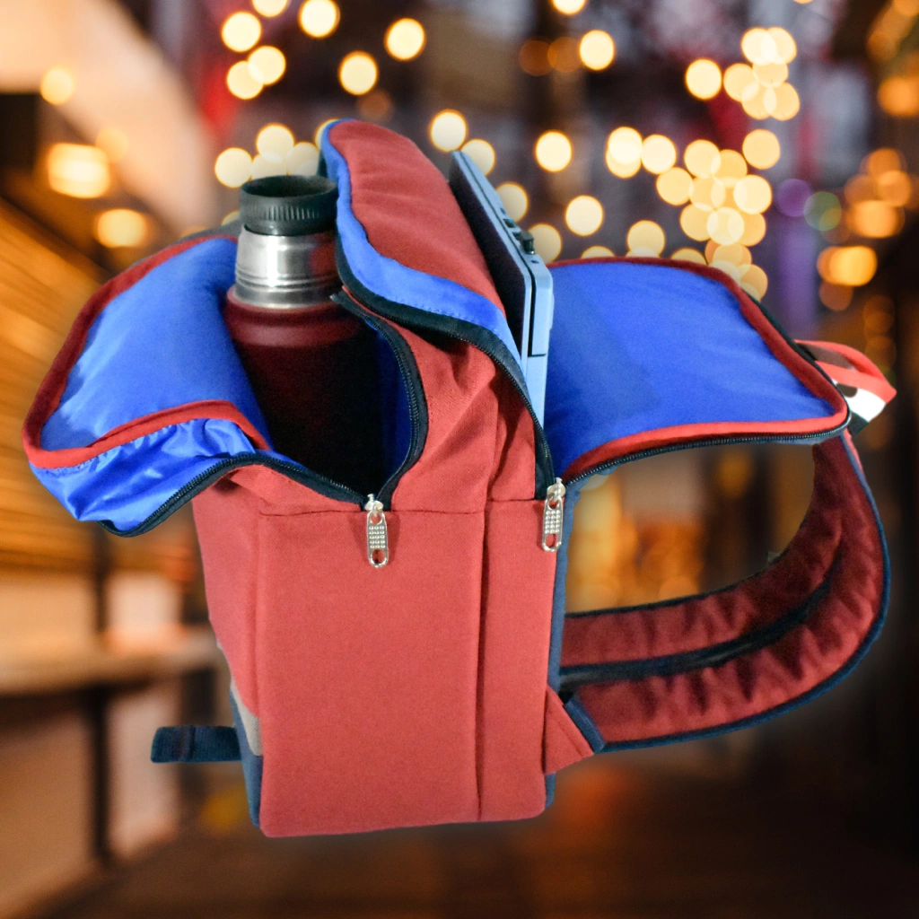 💖 Mochila porta notebook rojo tomate y azul con 2 bolsillos frontales, uno estilo sobre y otro con cirre. Tiene doble cierre para llevar la notebook 💻